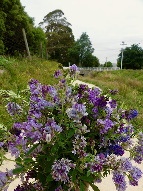 It was dull, showery & cool this year on Christmas day, so after spending some lovely time with our David & his wife in the morning we decided to go for a walk just off Norton road to see where the new walk & cycle way might take us to. Sometimes what we think would be ideal is not what was planned for us at all- we both felt ourselves relaxing, our breath deepening & then the gifts began to be offered to us. All along the way we found lucerne (alfalfa) in flower & loads of our beloved red clover.